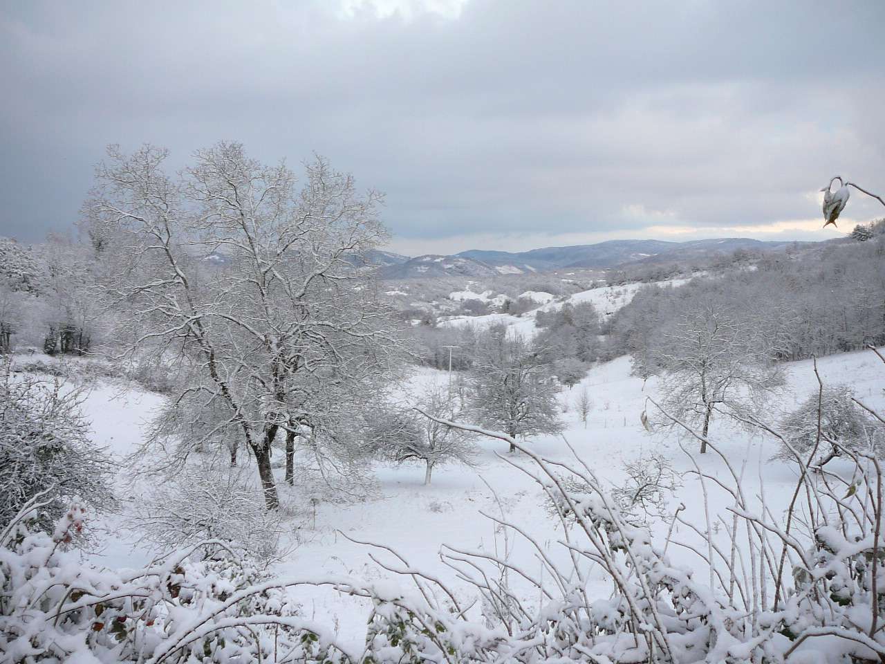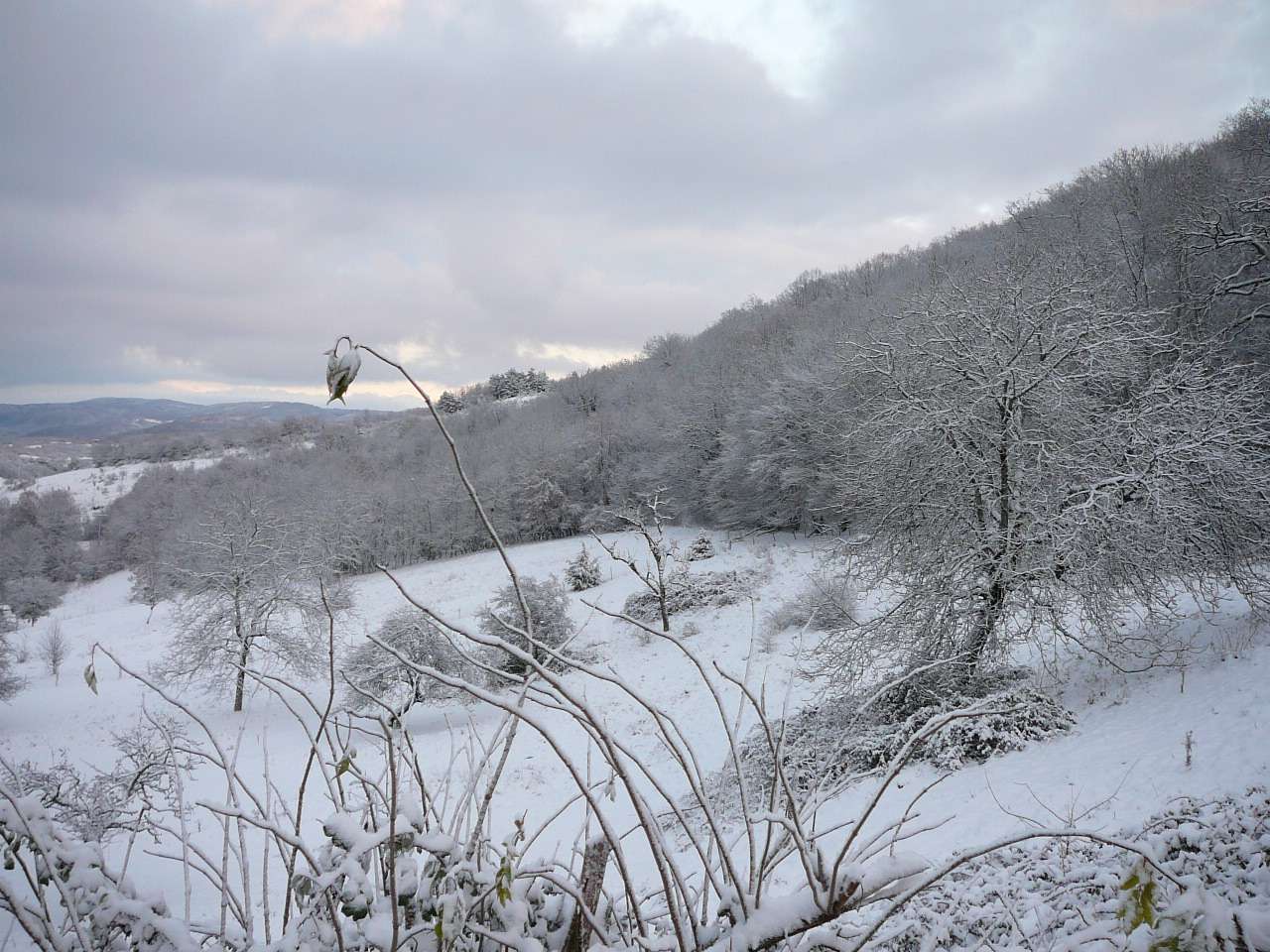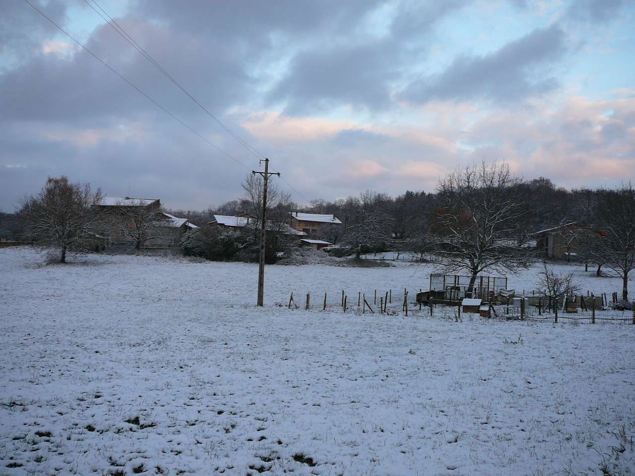 En cette fin novembre, l' hiver a fait une entrée remarquée sur l' Ain touchant en particulier dans un premier temps le haut Bugey. Voici quelques photos prises sur les hauteurs d' Ambronay en ce 26 novembre. La couche atteignait une petite dizaine de centimètres vers les 500 à 600 m d' altitude. Ce soir-là le mercure à 17 h affichait déjà -4,5°, présageant une nuit glaciale et elle le sera !, puisque le mercure descendit sous la barre des -10° sur les reliefs la nuit suivante.