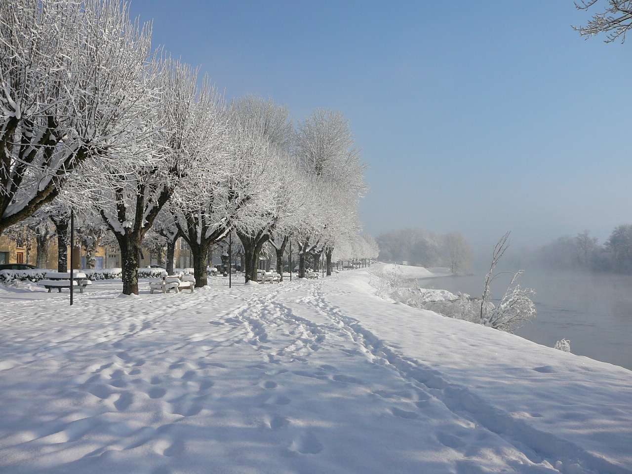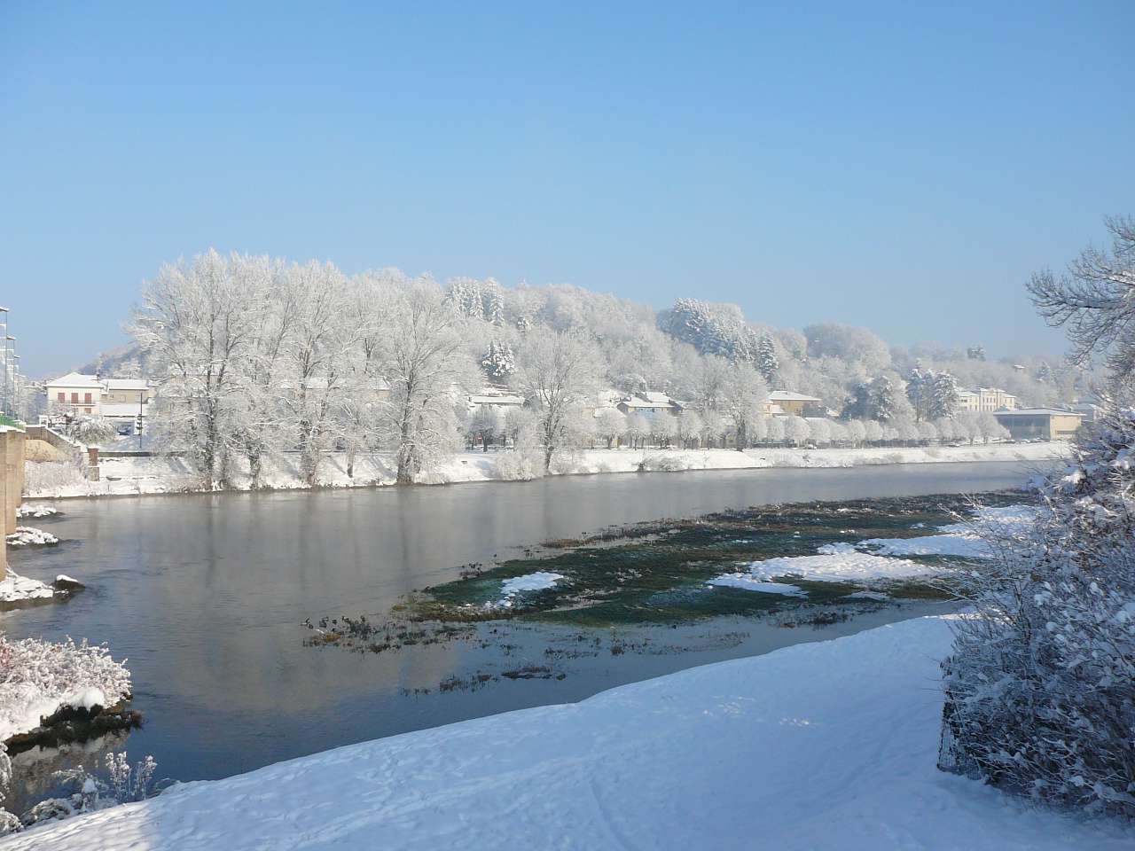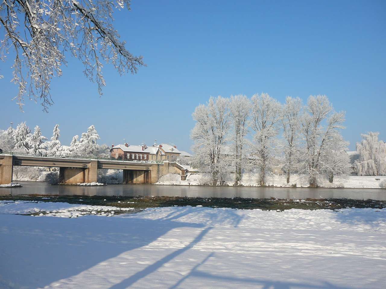 Paysages de cartes postales sur les bords de l' Ain en ce samedi 4 décembre après les chutes de neige assez importantes des jours précédents. On se serait cru dans une petite station de ski. Avec le soleil revenu et malgré un mercure largement négatif, il était très tentant d' aller profiter de faire une petite balade au bord de la rivière d' Ain à Pont d' Ain pour prendre quelques clichés, d' autant qu' en plaine ce genre de paysage ne reste souvent pas très longtemps....