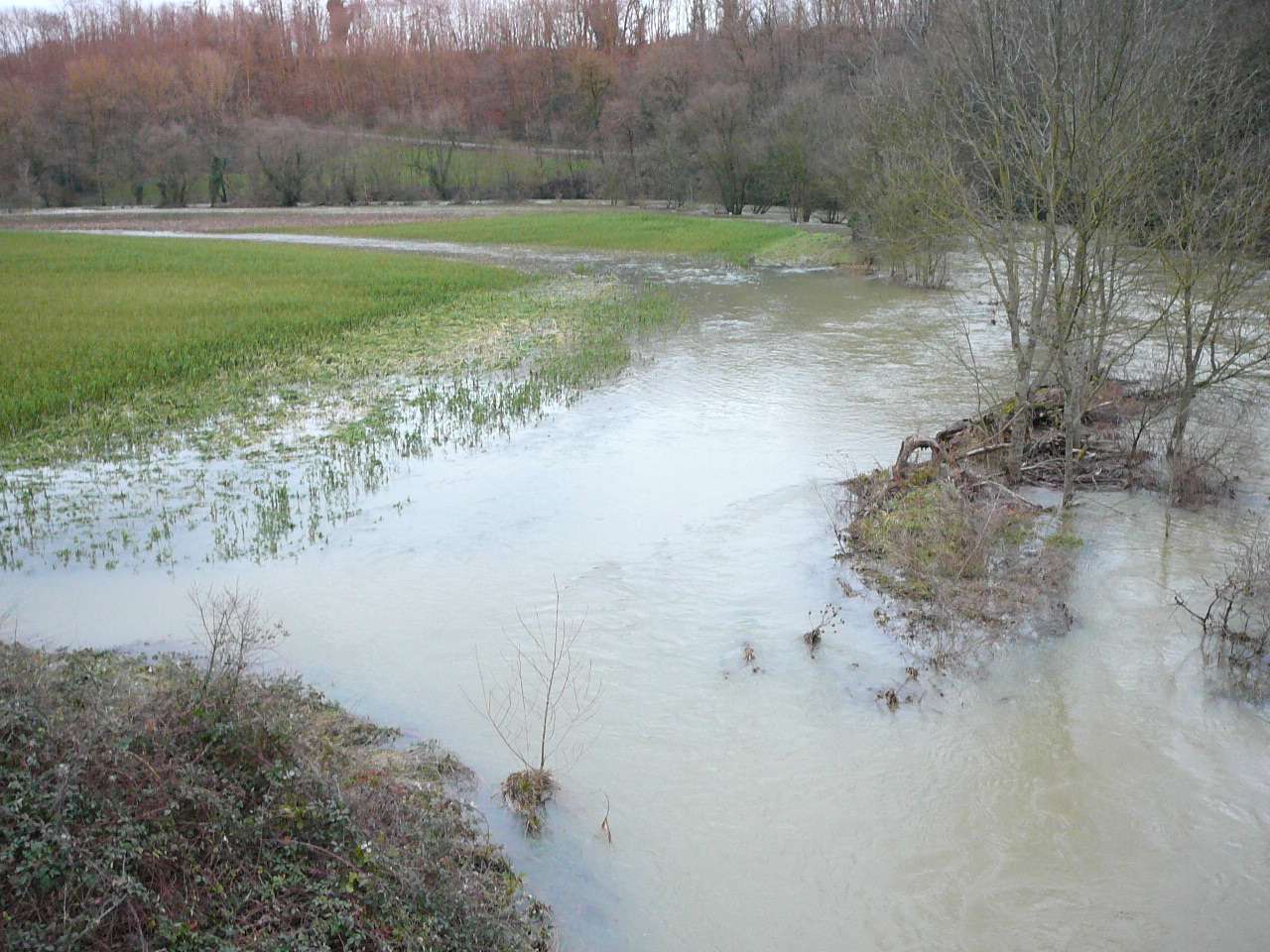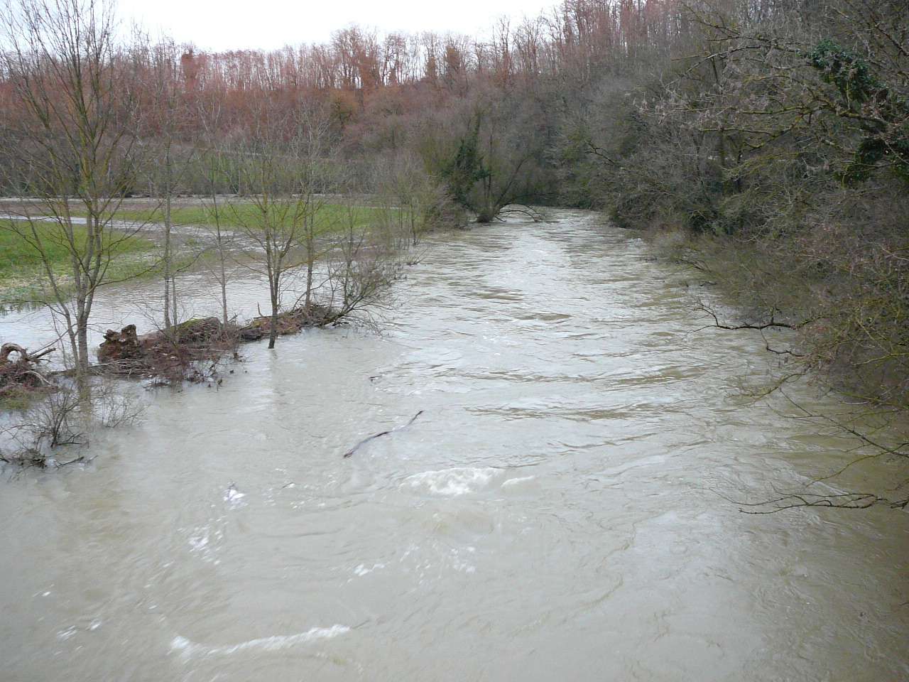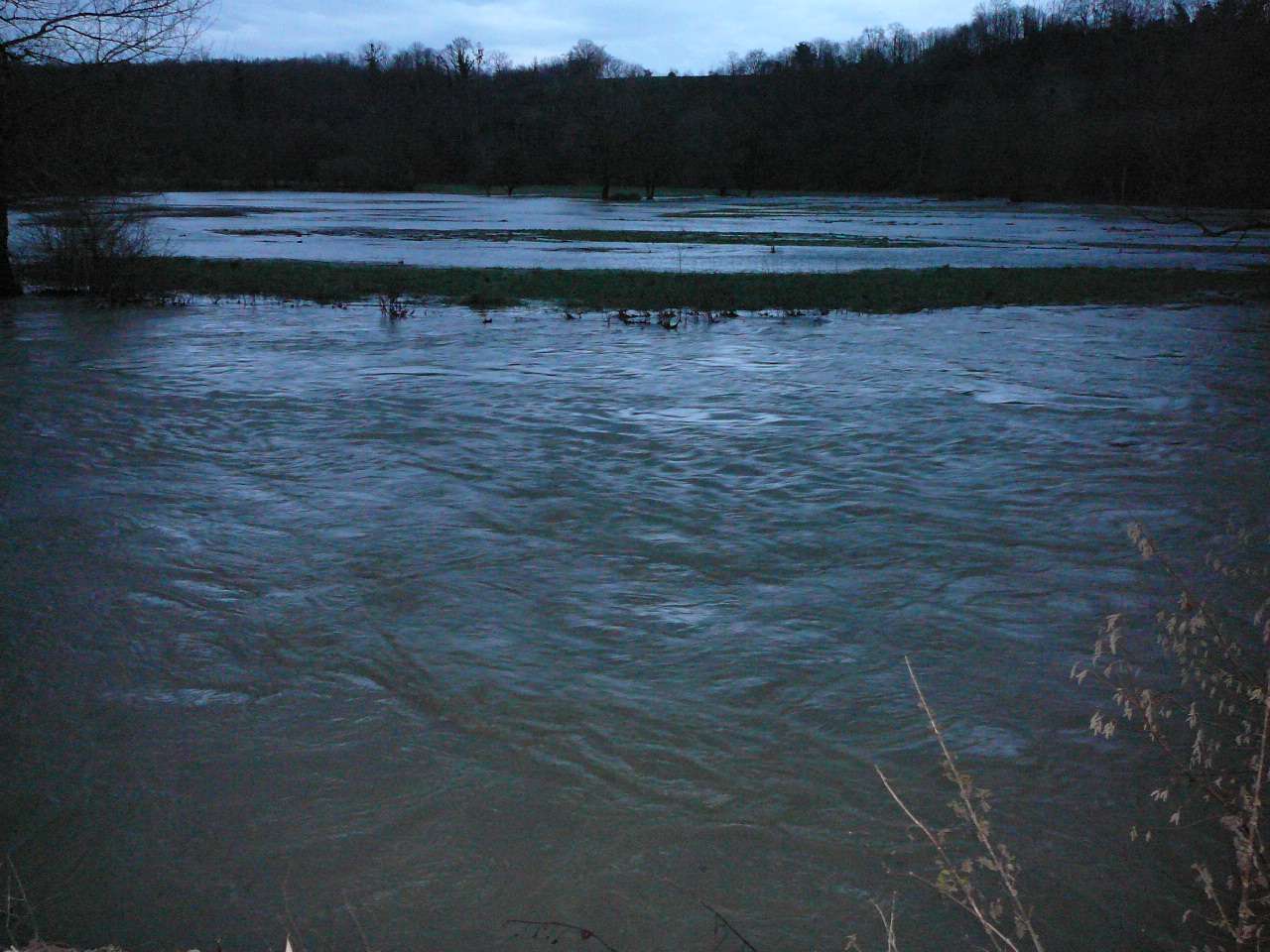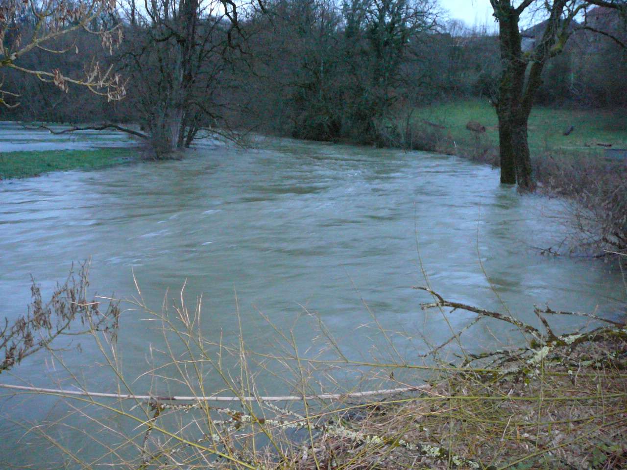 Les fortes pluies du jour couplées à un net redoux après les importantes chutes de neige tombées sur le Jura ont fait réagir le Suran; une situation classique pour ce cours d' eau capricieux qui peut grimper en seulement quelques heures; il se jette dans la rivière d' Ain à hauteur de Pont d' Ain. En ce soir du 7 décembre, il dépassa sa côte d' alerte et sa crue du printemps 2008. Il s' étalait dans la toute la vallée de l' Ain. Il a fallu attendre le lendemain pour un début de décrue.